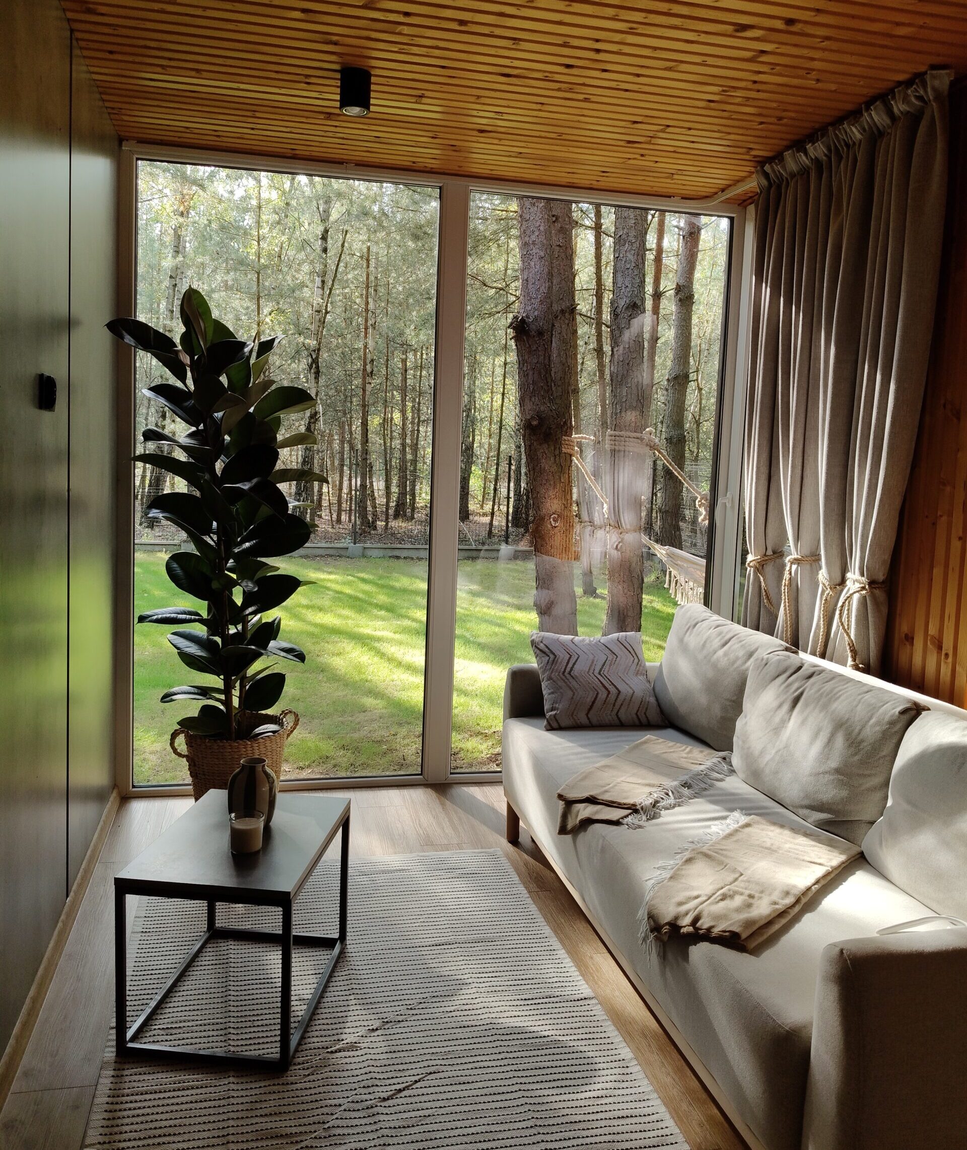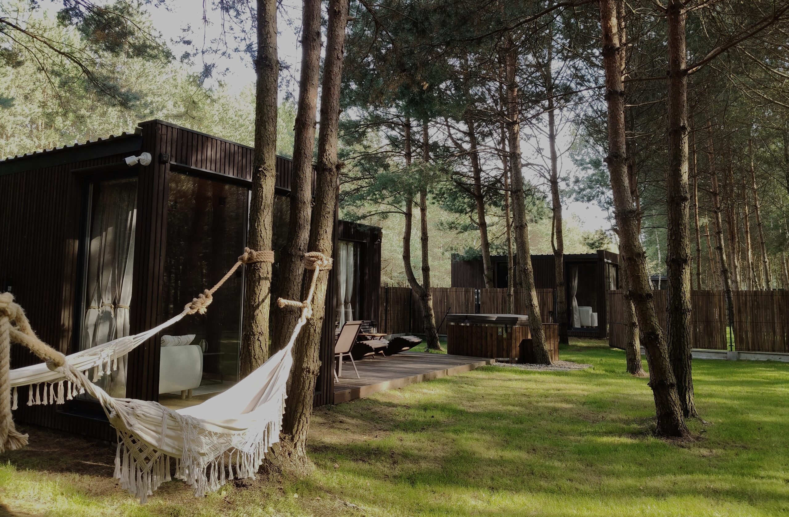 Kompleks 3 luksusowych domków z dużymi prywatnymi ogrodami. Idealne dla par lub kameralnych grup do 4 osób. W domkach znajduje się salon z kuchnią, sypialnia z widokiem na otaczającą naturę oraz przeszklona łazienka z wolnostojącą wanną. W podświetlonym ogrodzie znajdą Państwo gorącą balię i hamaki na chwilę relaksu, a w części wspólnej saunę ze śpiewem ptaków.