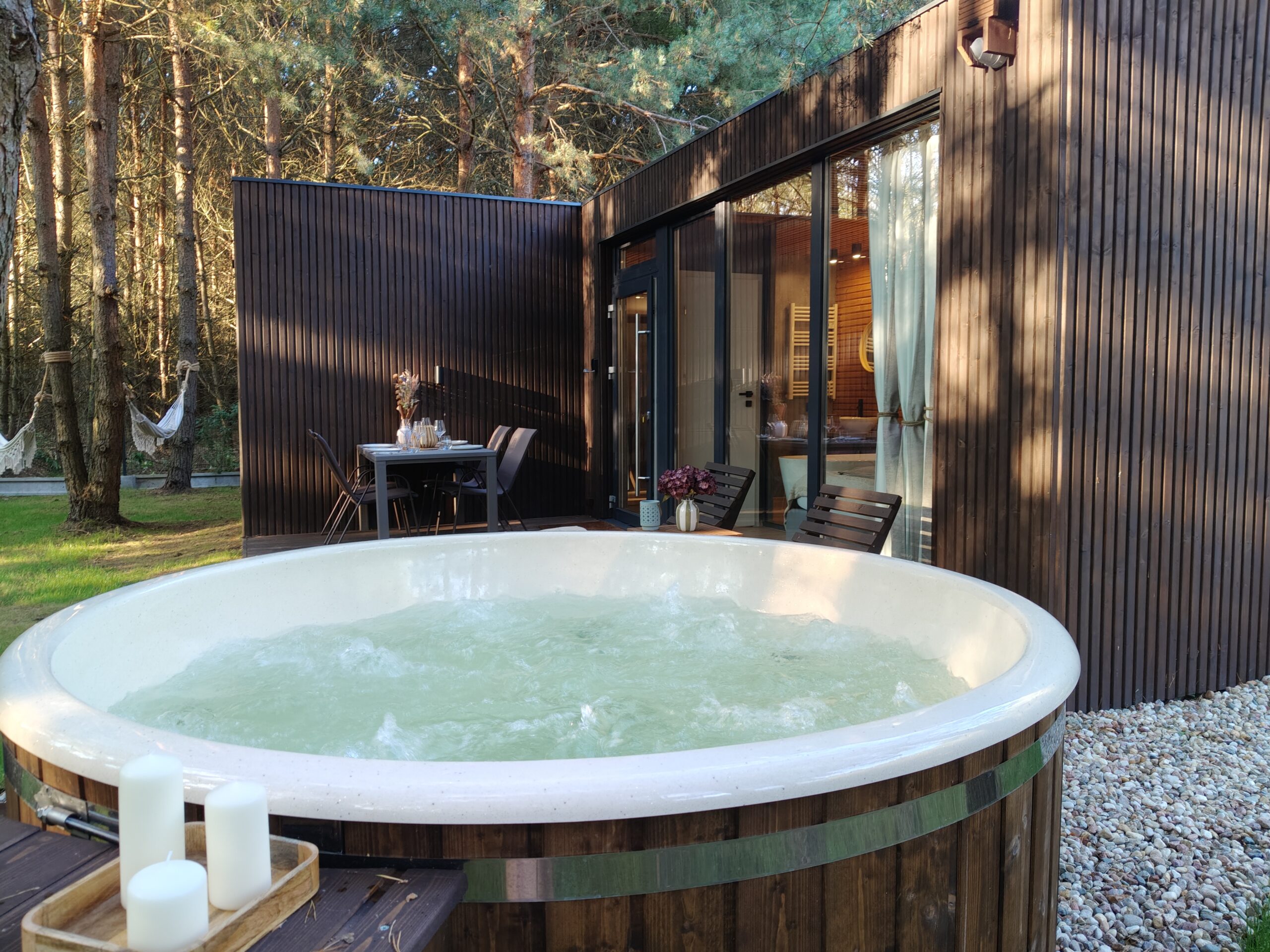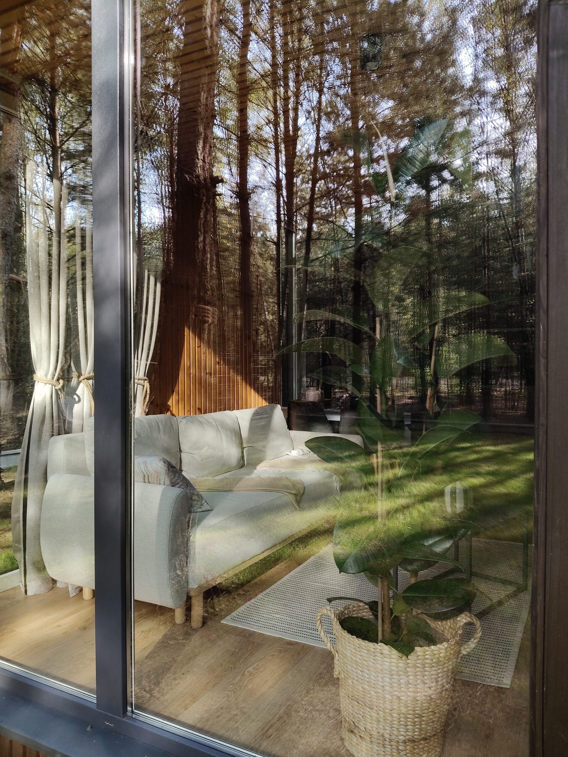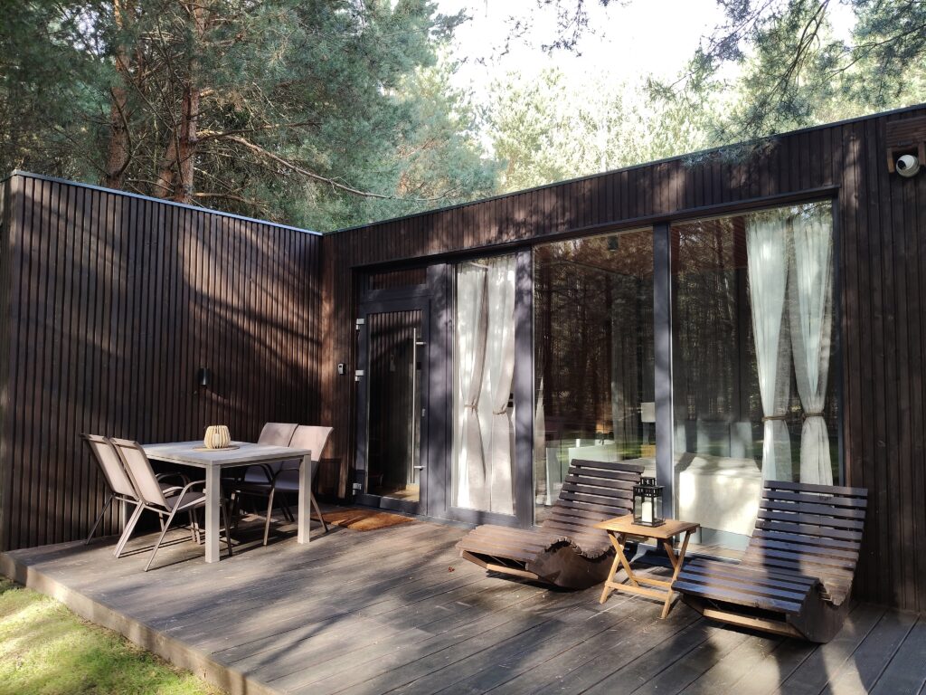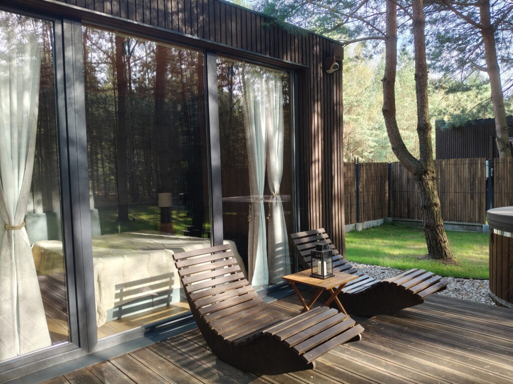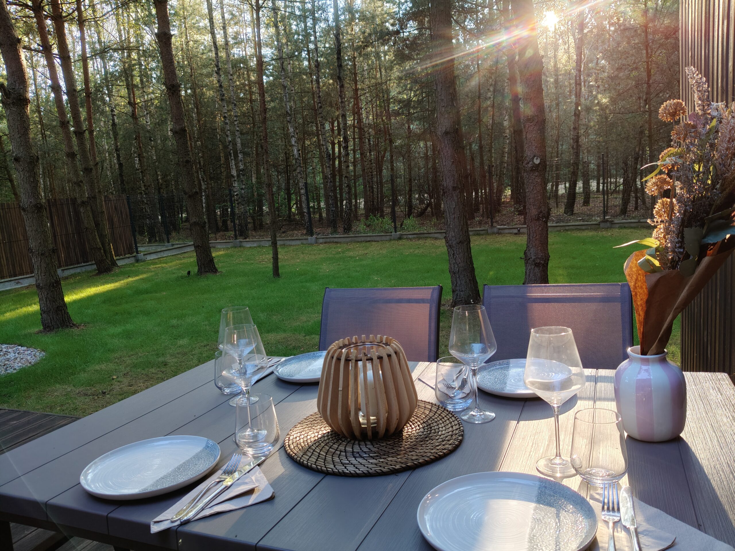 Zrelaksuj się w miejscu, gdzie jedynym dźwiękiem jest szum drzew i śpiew ptaków. Każdy domek posiada taras z widokiem na zieleń w Puszczy Białej.