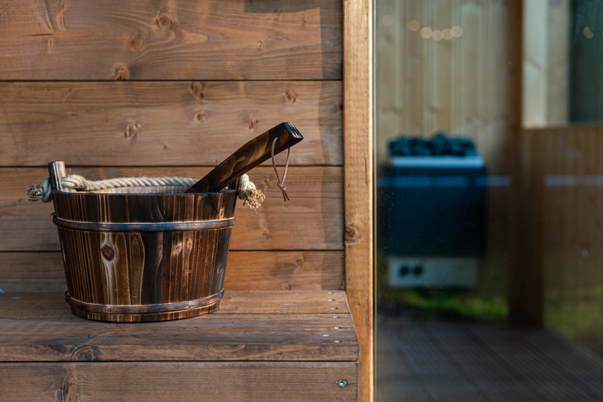 Fińska sauna z dużym przeszkleniem na las i śpiewem ptaków.