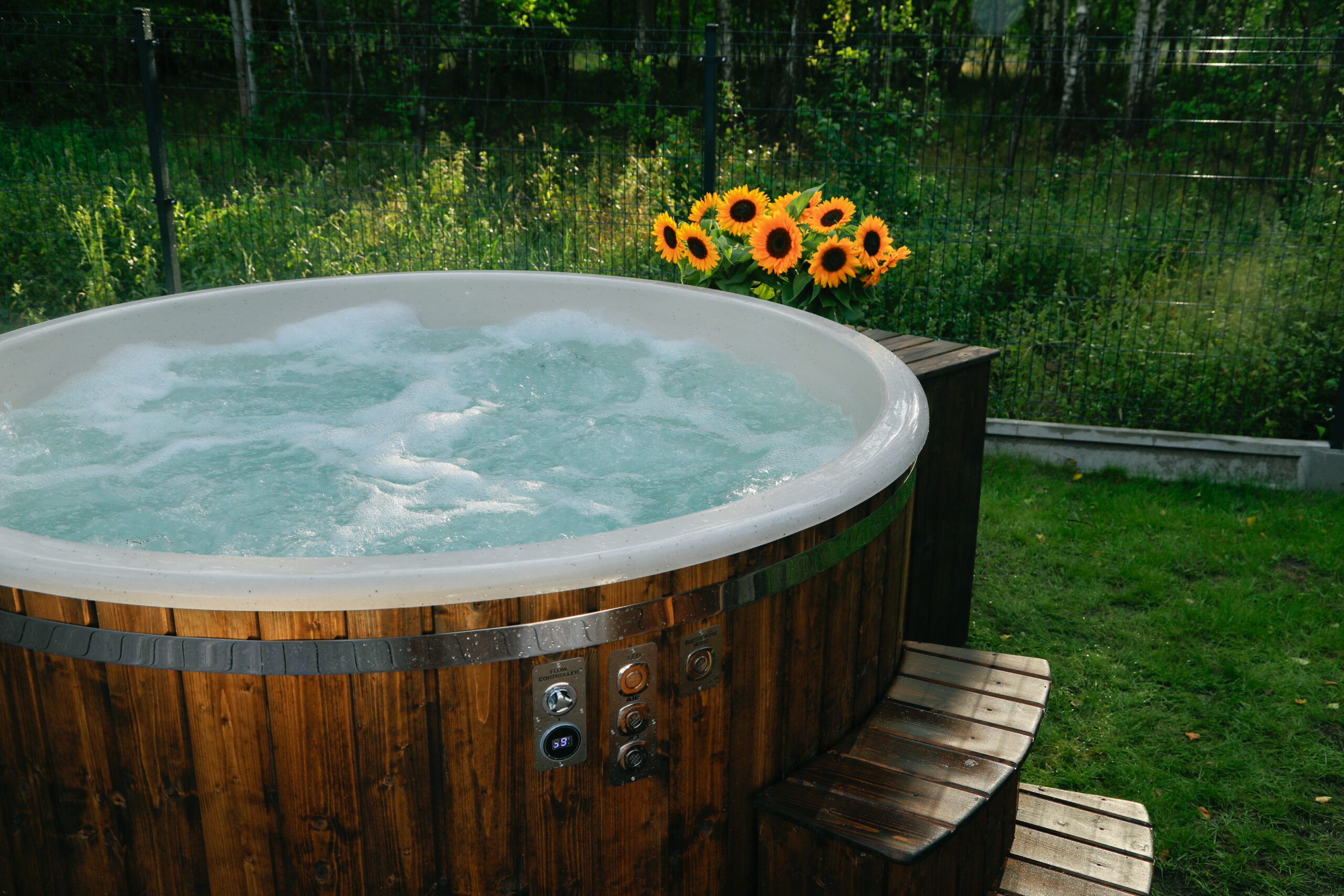 Duże 8 osobowe jacuzzi z aero i hydromasażem dostępne cały rok.